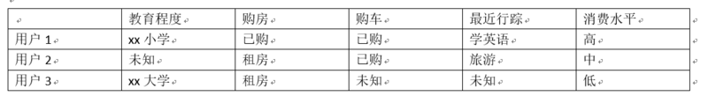 来我店的用户可能是穷学生、富婆、牛奋、各种角色,所以我都不知道是从收入、还是职业、还是籍贯来分类了。于是我干脆设计了一张表,然后去找了一个信用中介买了些数据。