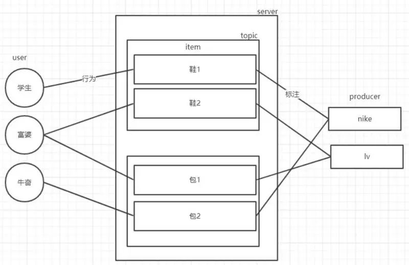 把上述一次可能发生的商业活动定义成上面的模型图,并确定了几大主体:用户(user),商家(server)、商品(item)。而商品上面隐藏的信息主体有主题(topic),以及商品背后的生产商(producer)。