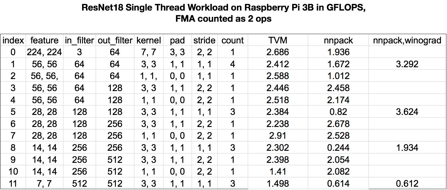 在结果的第一部分,我们比较了 TVM CPU 计划与 nnpack 在树莓派 3B 上执行 ResNet 任务的表现。由于时间有限,我们使用 TVM 实现直接卷积,而 nnpack 对 3×3 内核执行 winograd 转换。