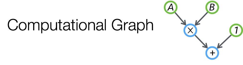 堆栈的第一级是基于计算图的表征。计算图是一个有向无环图,其表征作为节点的计算和作为边缘的数据流依赖性。这一表征非常强大:它允许我们将操作属性融入到计算图中,并指定转换规则以迭代优化计算图。这是一个被大多数现有深度学习框架的采用的惯常方法,包括 TVM 堆栈中的 NNVM 图表征、TensorFlow XLA 和英特尔的 ngraph。