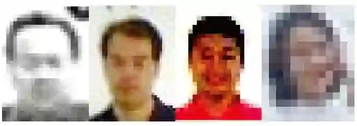 由于成像条件的原因,各种来源的大部分人脸图像都面临分辨率低、角度不正等问题。在通常的监控系统中,一部分是广角镜头,另一部分为了得到大的监控范围而安装位置较高,这些情况下都会得到较小的目标图像,还有一种情况是许多有反侦查能力的犯罪嫌疑人都会远离摄像头甚至躲避摄像头。根据实验证明,当人脸图像的分辨率低到12×16 像素以下时,就基本失去了辨认的价值,再考虑角度、噪声以及模糊因素的干扰,给普通人的面部辨识工作带来很大困难。