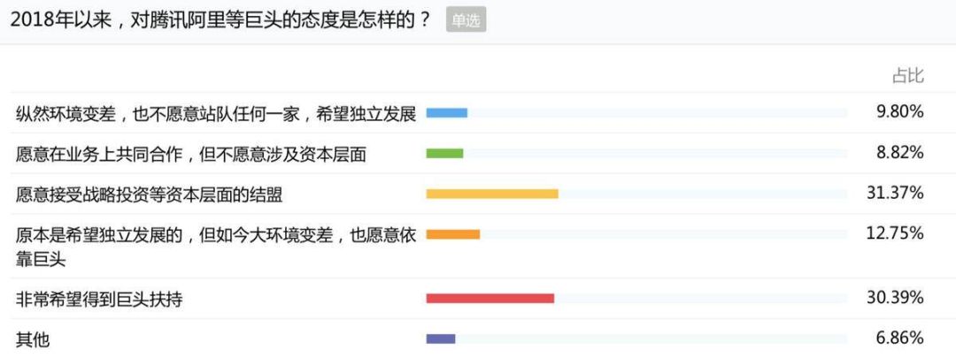 孙强把这定义为“烧钱、圈地、垄断、变现”价值创造模式发生转变的一年。而36氪曾在2018年底做过一项针对创业者的调查。不同于过去二十年创业们“追求独立”的普遍论调,当时,受访者中希望得到巨头扶植和资金的人,占比高达3/4,完全不愿意站队的仅不到1成。