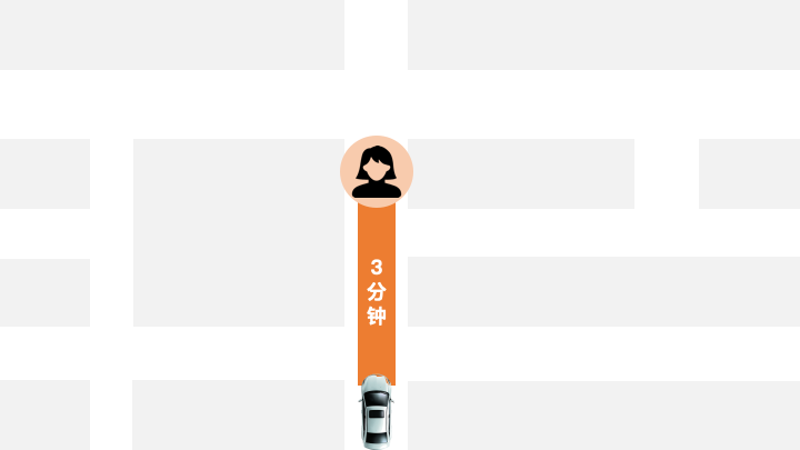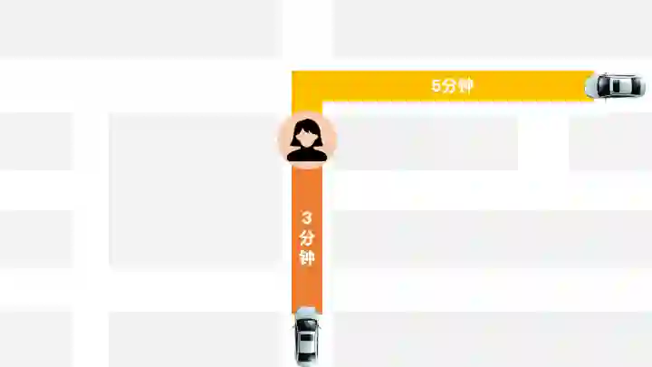 和再大家澄清一下,我们所采用的批量匹配的模式和大家所希望的,“把离我最近的司机派给我”的「就近派单模式」并不矛盾,我们也是寻求“乘客接驾时长最短”的最优解,大多数情况下也是指派离你最近的司机,但充分满足每一个乘客的“把离我最近的司机派给我”的个体需求, 有些时候反而会导致部分乘客的需求无法得到满足,比如说下面这种情况: