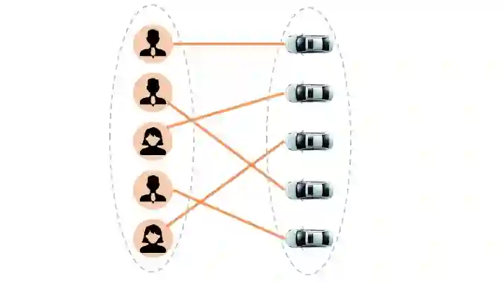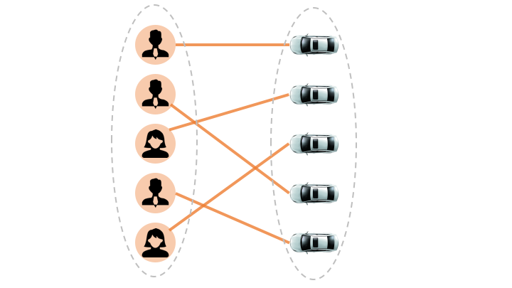 找寻司机和订单分配的全局最优是一个 二分图匹配问题 (bipartite graph matching) ,一边是乘客、一边是司机,可用运筹优化中各种解决Matching问题的方法进行求解。