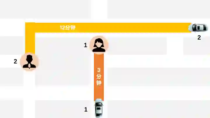当编号1和2两个乘客同时叫车, 如果完全按照“就近派单”的模式, 虽然可以让1号乘客先被接单, 但是2号乘客会因为接驾距离较远, 导致等待时间变长, 甚至因为最近的司机超出平台派单距离, 导致2号乘客叫不到车。1、2号乘客总等待时长15分钟, 平均等待时长7.5分钟。