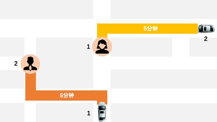 把1号车派给2号乘客, 这样一来, 1号乘客和2号乘客, 平均等待时长缩短为5分钟, 比就近派单,缩短了2.5分钟, 总等待时长缩短为10分钟, 比就近派单, 缩短了足足5分钟。