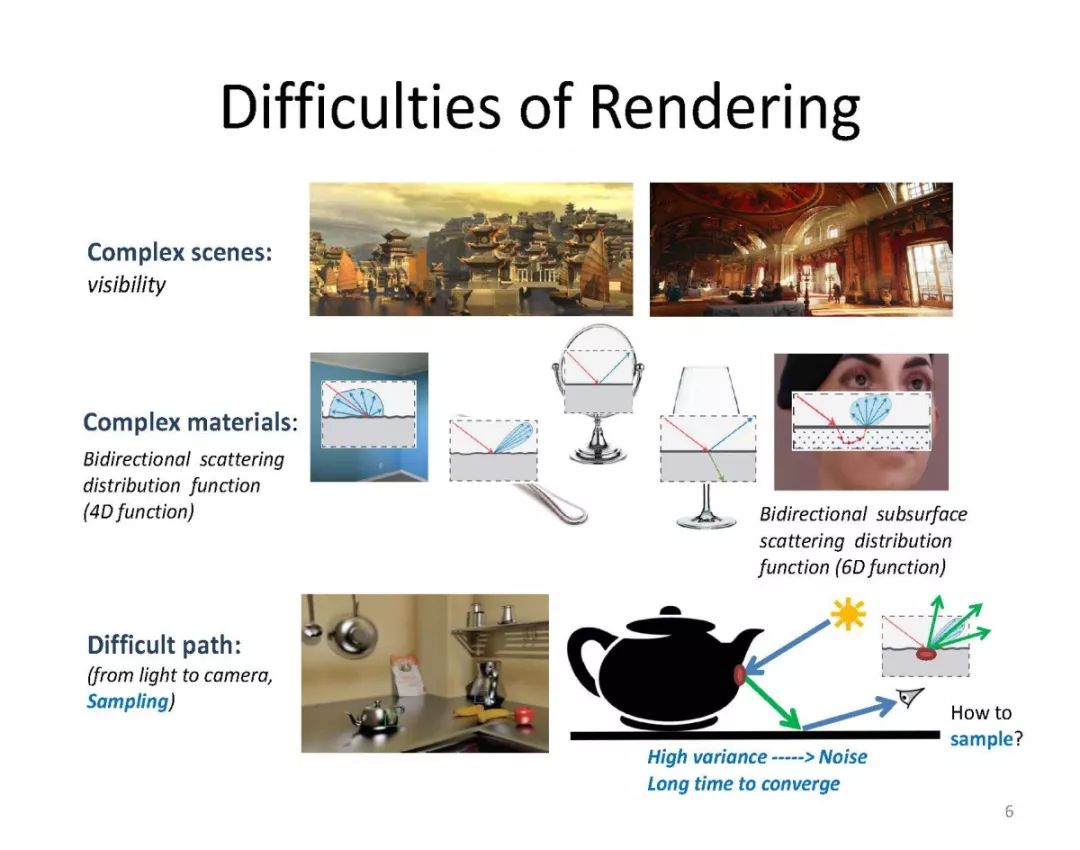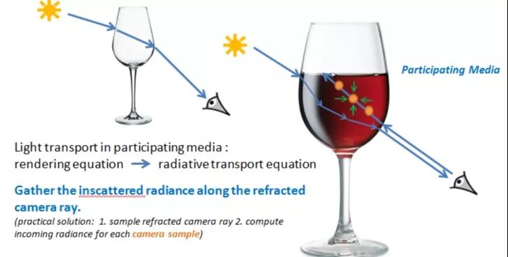 复杂参与介质光线传递过程中,存在单次散射、二次散射和多次散射等复杂光学现象,如何简洁而高效的物理建模是参与介质图像绘制的基础。例如一杯简单的红酒,如何体现玻璃杯中红酒的逼真的光色,参与介质光线传递过程和多次散射建模就是关键,而简单的表面绘制方法远远不能达到真假难辨的绘制效果。