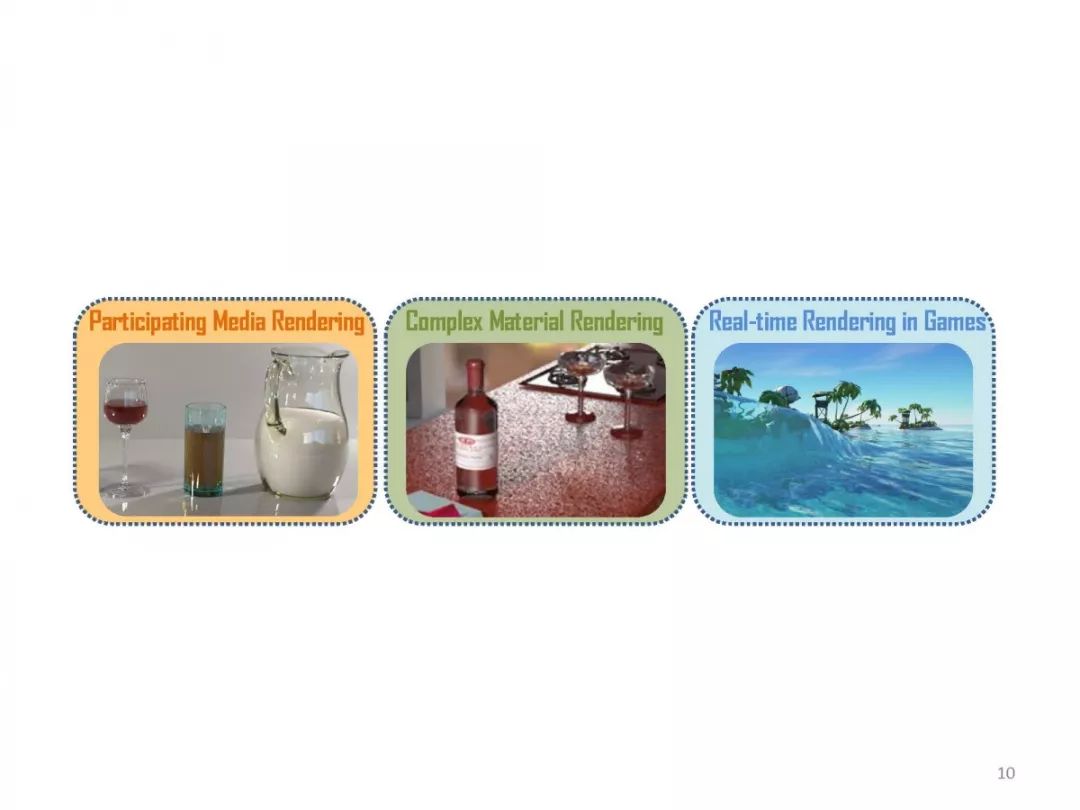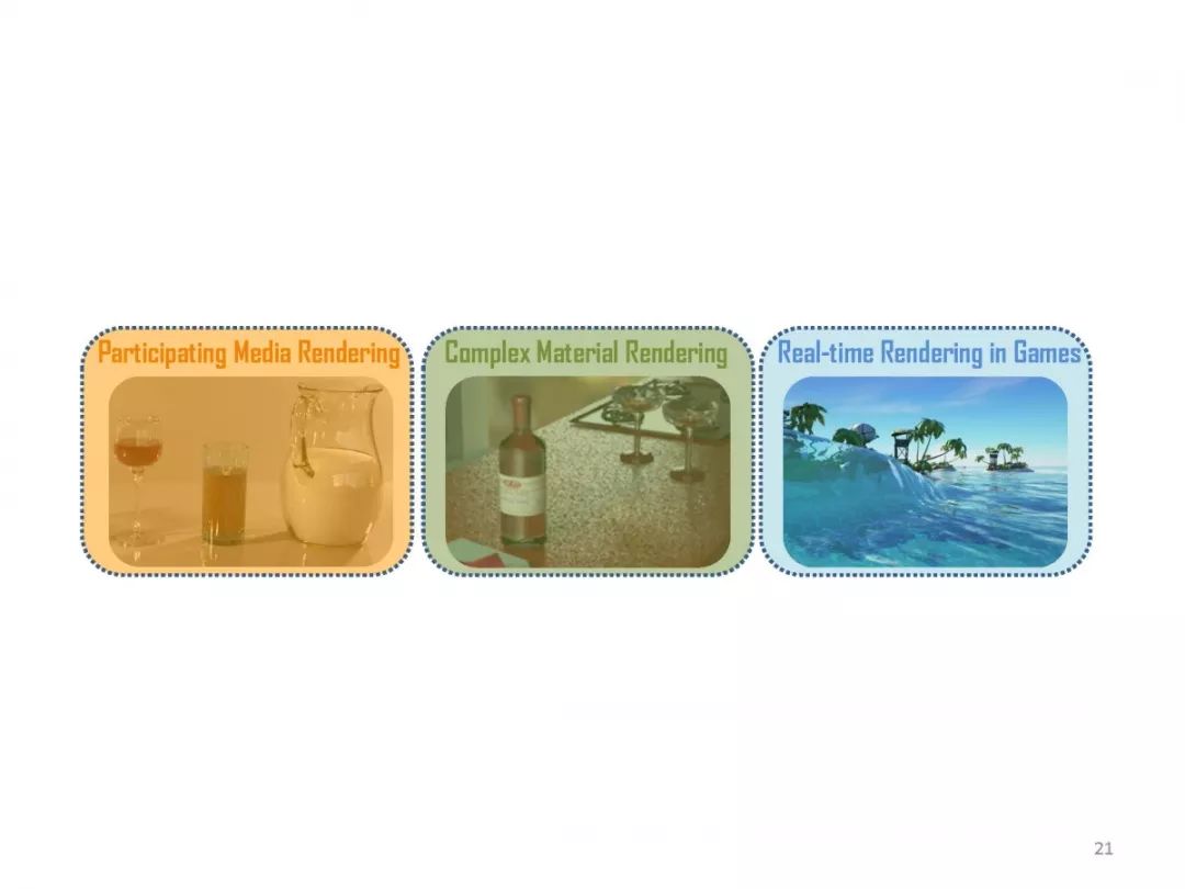目前参与介质可交互或者实时渲染算法只能支持某种特定类型的参与介质:高平均自由程或者低平均自由程,或者假设参与介质没有边界。由于计算资源限制,此外,模型假设简单,往往导致渲染精度较低,在线渲染的实时性问题突出。
