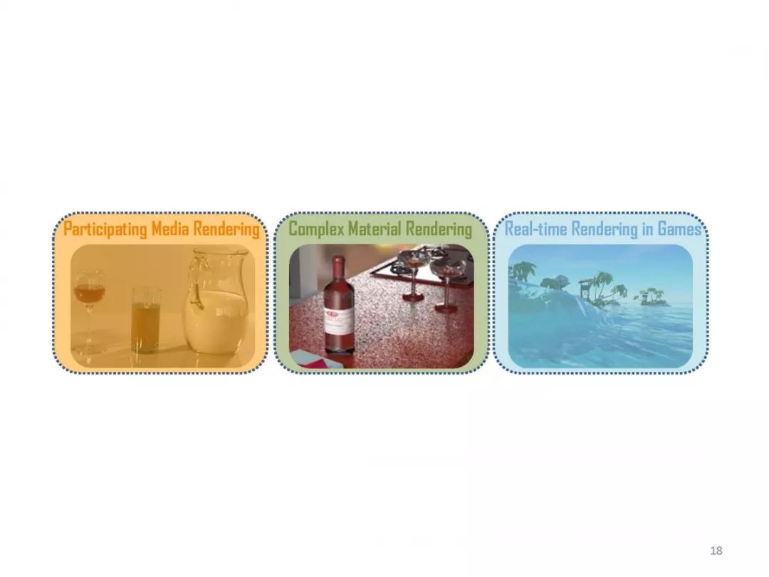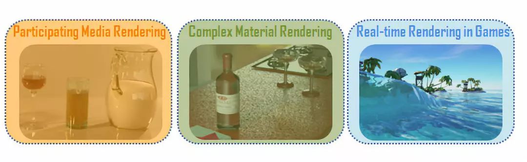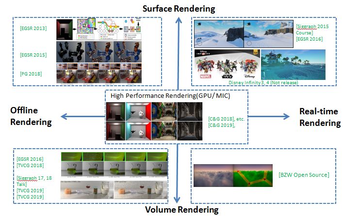 主要研究方向是计算机图形学绘制,包括全局光照算法、参与性介质光线传递和复杂材质模型等。