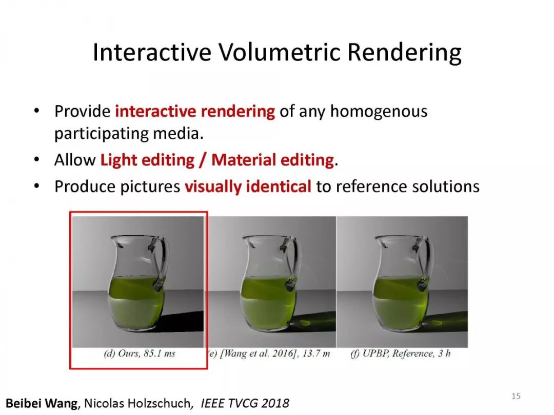 [2] Beibei Wang*, Nicolas Holzschuch. Point-Based Rendering for Homogeneous Participating Media with Refractive Boundaries, IEEE Transactions on Visualization and Computer Graphics, 2018, 24 (10), pp.2743-2757.