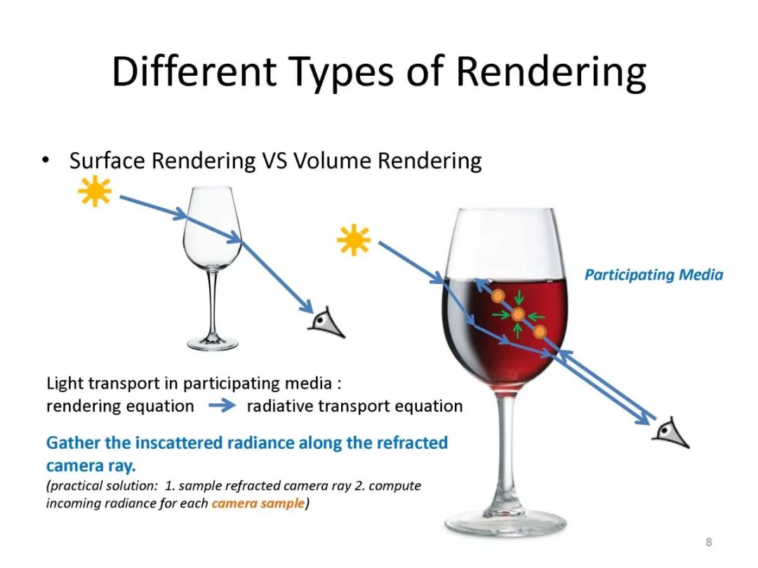 在表面渲染中,光线只在物体表面发生改变;而在参与介质中,则会被吸收或者散射,从而改变原始的传播方向,引起传播方向光能的增强或衰减。光线在参与介质中吸收和散射的强度,可以用吸收系数和散射系数来表示,前者描述了空间中每单位长度中光子被吸收的概率,后者则描述了每单位长度中光子被散射的概率。当散射发生时,散射到每个方向的概率用相位函数来表示,大体可以分为前向散射和后向散射。吸收系数和散射系数之和称为衰减系数,代表了单位距离内光子出射到其他方向或者被吸收掉的总概率。