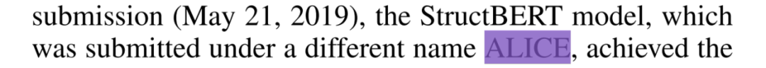 当然,因为好奇达摩院能搞出什么黑科技,一直都想知道 ALICE 到底是什么机制,还根据缩写瞎猜了一通。结果突然看到篇阿里文章,StructBERT: Incorporating Language Structures into Pre-training for Deep Language Understanding,结果看见一行字。
