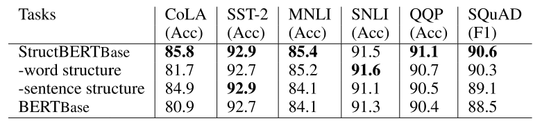 去掉句间结构任务,对 MNLI,SNLI,QQP,SQuAD 这样的句子对任务影响比较大。