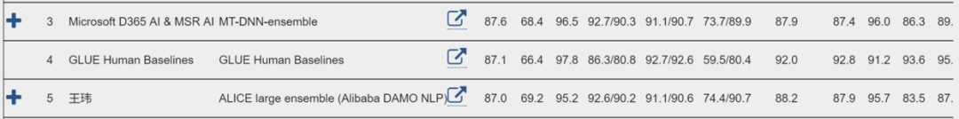 在 XLNet 与 RoBERTa 还未高高挂在 GLUE 榜首的前 XLNet 时代,除了靠着一系列奇技淫巧,比如预训练后精调前加一多任务预训练(Multi-Task Pretraining),还有用集成模型作为老师的知识蒸馏(Knowledge Distillation),位居榜首的 MT-DNN,然后就是紧跟着我们人类的表现,之后便是此次事件的主角,来自阿里达摩院的 ALICE 模型。