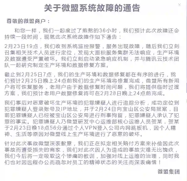 近日微盟官网发送一则故障通知,该通知称其公司业务系统数据库(包括主备)遭遇其公司运维人员的删除。据悉,目前犯罪嫌疑人已经被宝山区公安局进行刑事拘留,犯罪嫌疑人承认了犯罪的事实。犯罪嫌疑人乃微盟研发中心运维部核心运维人员贺某,贺某于2月23日晚18点56分通过个人VPN上网登入公司内网跳板机,因个人精神、生活等原因对微盟线上生产环境进行了恶意的破坏。