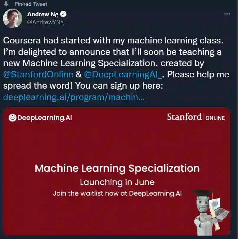 本课程将被一门新的、扩展更深的《Machine Learning Specialization》所取代。新课程依然由 Stanford Online 和 DeepLearning.AI 联合推出,并将于 6 月上线。