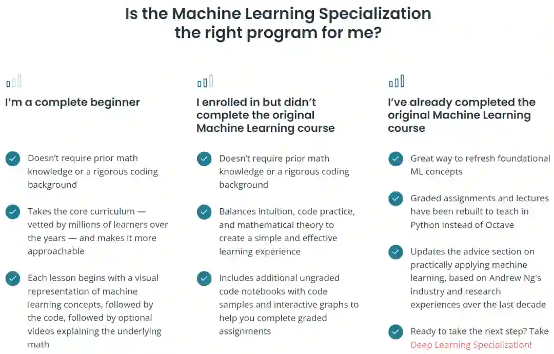 课程页面显示,「Machine Learning Specialization」是经过重新改进的,新课程比以往版本更具相关性(more relevant than ever),新课程扩展出了 3 门课程,可以满足不同人群的需求。