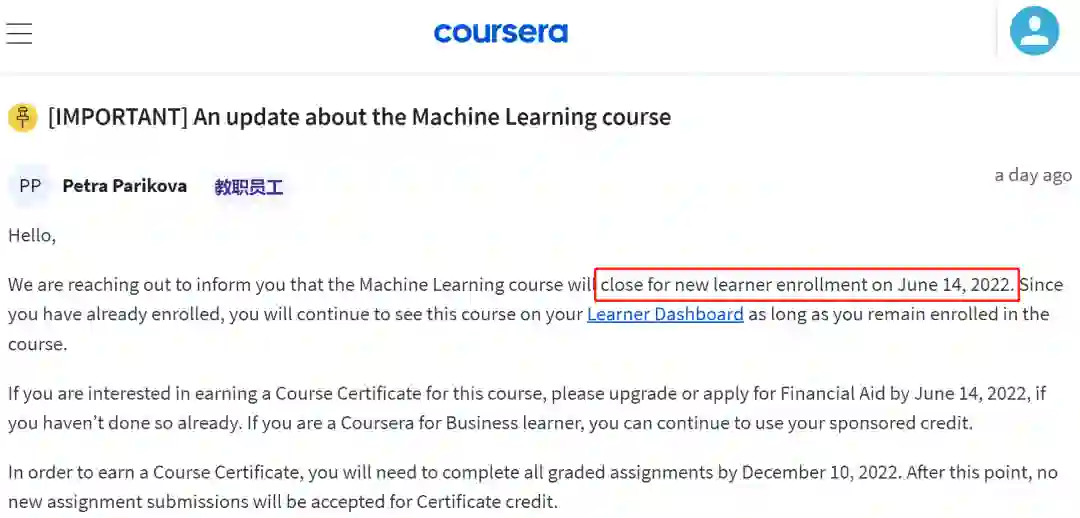 然而昨日,Stanford Online 和 DeepLearning.AI 团队宣布了一项重要通知:《机器学习》课程将从 2022 年 6 月 14 日起关闭在 Coursera 上的新学员注册。