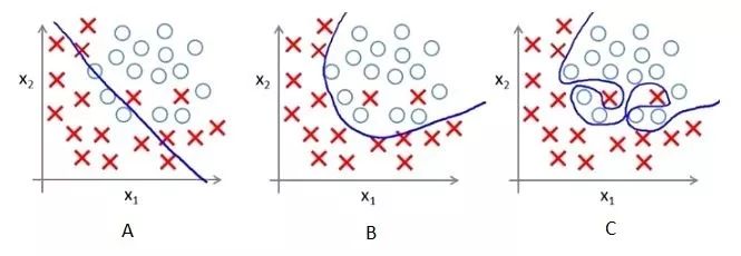上图中哪一个显示了决策边界过度拟合训练数据?