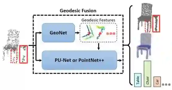 为证明这种学习型的测地表示的有效性,旷视西雅图研究院、UCLA 等机构提出一种融合方案,即把 GeoNet 与其他 baseline 和 backbone 相结合,比如 PU-Net、PointNet++,用于若干对潜在网格曲面特征理解有较高要求的点云分析任务。