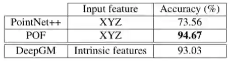 非刚性形状分类的实验结果如表 6 所示。尽管 POF 和 PointNet++ 只把欧式坐标系的点云作为输入,DeepGM 需要在 groudtruth 测地度量空间中利用精确网格数据获取线下计算的固有特征。尽管所用数据信息量更少,但 POF 相较其他方法精度更高。