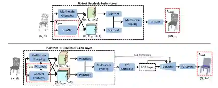 图 3:PU-Net(上)和 PointNet++(下)测地融合方案。