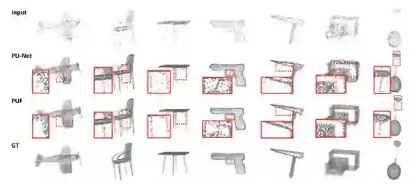 由于测地邻域较于欧氏邻域具有更丰富的潜在点集拓扑学信息,PUF 上采样产生更少的异常值,并复原更多的细节,比如曲线及尖锐结构,如图 5 所示。