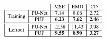 本文在点云上采样任务重测试 PUF,结果如表 3 所示。本文在 3 个指标上与当前最优的点云上采样方法 PU-Net 进行了对比:MSE、EMD 以及倒角距离 CD(Chamfer Distance)。