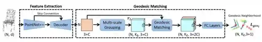 本文通过训练 GeoNet 学习上述定义的函数 f。它包含一个带有跳跃式连接(skip connections)的自动编码器层,以及一个多尺度的测地匹配层(GM),起到利用点集潜在的空间特征的作用。