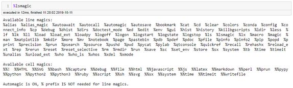 如果你只记得一个魔术命令,那必须得是这一个。执行 %lsmagic 命令将提供所有可用魔术命令的列表:
