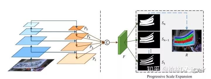 这个文章主要做的创新点大概就是预测多个分割结果,分别是S1,S2,S3…Sn代表不同的等级面积的结果,S1最小,基本就是文本骨架,Sn最大。然后在后处理的过程中,先用最小的预测结果去区分文本,再逐步扩张成正常文本大小。。。
