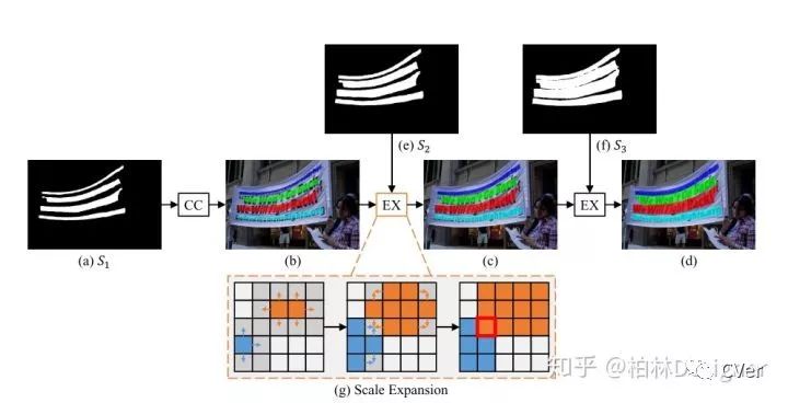 如上图所示,网络有三个分割结果,分别是S1,S2,S3.首先利用最小的kernel生成的S1来区分四个文本实例,然后再逐步扩张成S2和S3