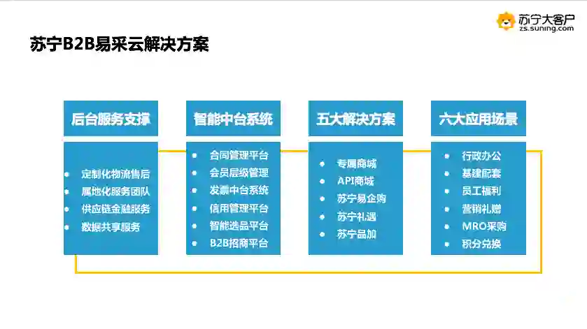 基于对企业采购场景的理解,我们提出了苏宁易采云,有基于六个应用场景的五个解决方案,也有大中台处理定制化需求,还有后台服务支撑: