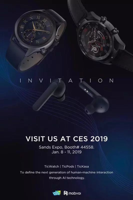 此次参展,最新旗舰型智能手表TicWatch Pro、TicWatch系列手表、真无线智能耳机TicPods Free,以及智能音箱TicKasa系列将一同亮相展台。