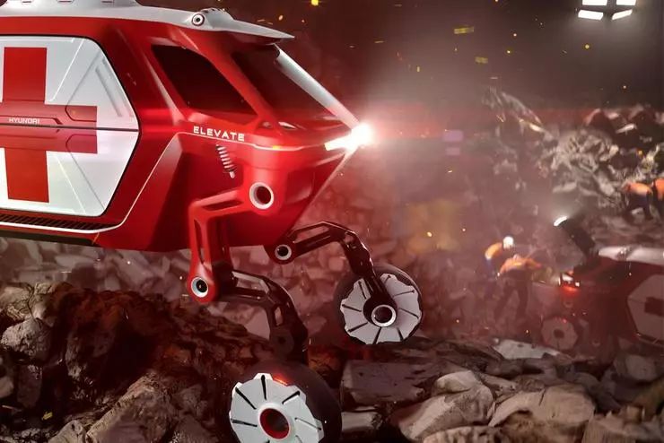 本届CES上,现代的新闻发布会将采用名为Elevate的步行攀爬车概念。它有轮子,可以像普通汽车一样行进,此外它还在车轮和车身之间有铰接的支腿,允许它抬起并“爬”过轮胎无法征服的障碍物。这一步行攀爬车可以用来帮助自然灾害的幸存者,或可以为一种新型的外星探测车奠定基础。