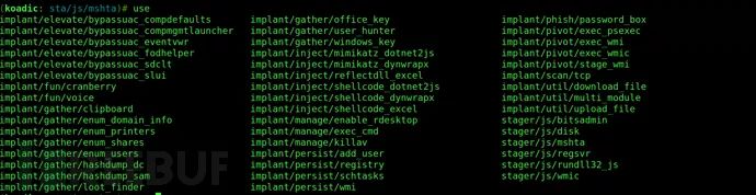 查看Koadic上可用的所有模块,请输入“use”,然后双击Tab键。