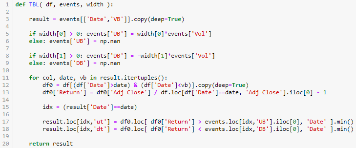 TB 和 FH 方法相似,我们需要三种情况来为数据打上 +1, -1, 0 三个标签,而打哪个标签看价格函数先碰到三隔栏的哪一个。