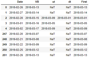 用 TBL 函数来确定三隔栏中的哪一个隔栏被突破了。下面代码第 3 行做的就是这件事,在 'VB', 'ut' 和 'dt' 栏下的日期中找出最小值(把 NaN 当做无限大),