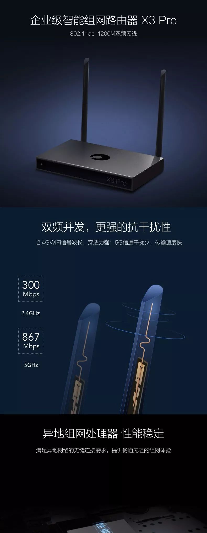 配置方面,蒲公英X3 Pro采用2.4GHz和5GHz双频设计,支持802.11ac千兆Wi-Fi标准,具有更强的抗干扰性,兼顾2.4GHz信号穿透能力强以及5GHz信道干扰少传输速度快的优势,最高无线速率可达1167Mbps。