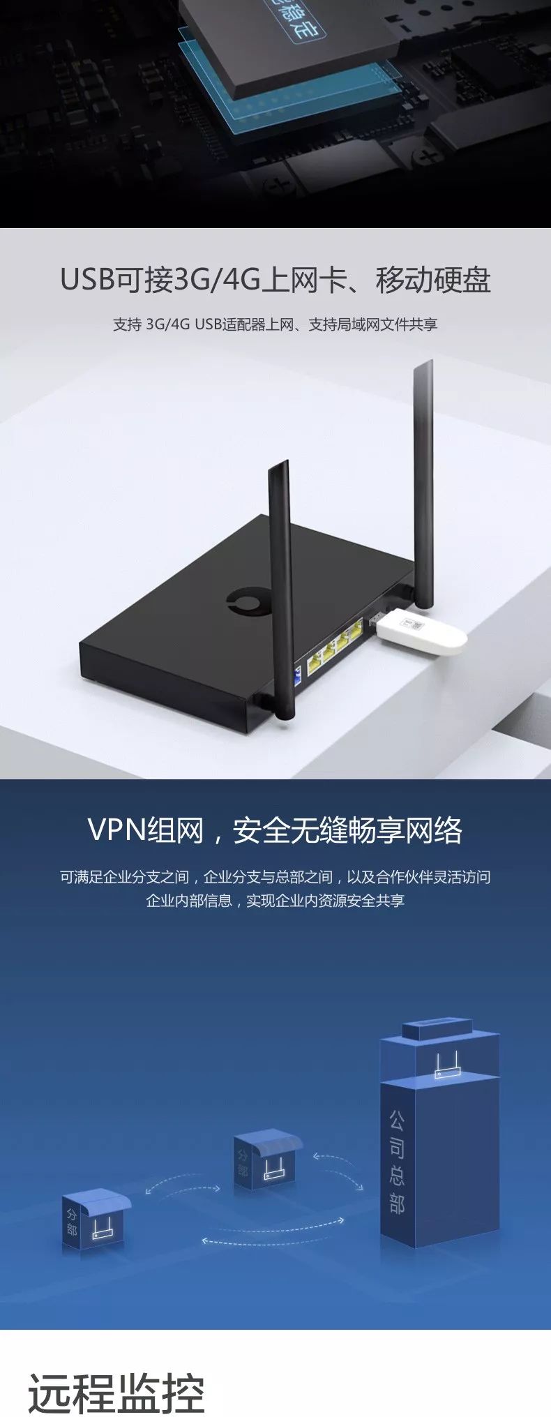 同时,该款路由器搭载高性能异地组网专用处理器,并提供5个自适应100M网口(1个WAN口、4个LAN口),以及1个标准USB接口,支持3G/4G USB适配器上网、局域网文件共享。