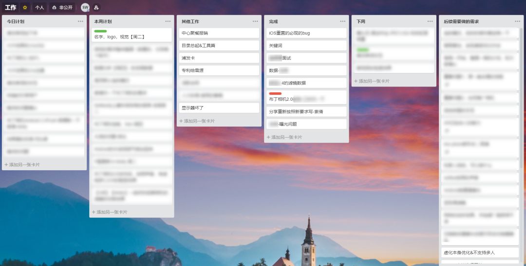 一件事情一张卡片,做完的事情移动到对应栏或者归档,分享一下我的分类。