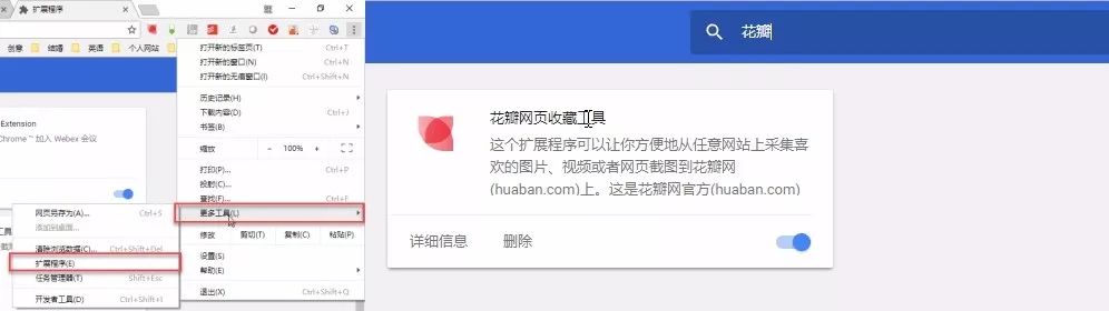 花瓣的Chrome插件下载方式:Chrome右上角->更多工具->扩展程序->搜索花瓣->添加即可使用