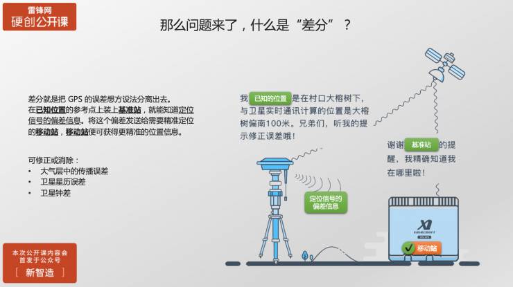 那什么是“差分”? 差分就是把GPS 的误差想方设法分离出去。具体做法是,在已知位置的参考点上装上基准站——参考点通常使用国家的基准点,它是一个厘米级甚至毫米级的位置点——通过RTCM数据就能知道它的定位。也就是说,这个基准站会说明两件事:告诉我所在的精准位置在哪里;我接到数据时的精准时间。然后把这个数据发送给想要获取高精度定位信息的移动站,后者就可以通过它获取的这个信息,修正或消除:大气层钟的传播误差、卫星星历误差和卫星钟差,把精准度做到厘米级。