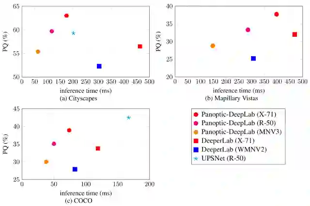 Panoptic-DeepLab 具有简单的架构和仅三个训练损失函数,可实现最先进的性能,同时比其他基于 Mask R-CNN 的方法更快。综上所述,我们开发了第一个单镜头全景分割模型,在多个公共基准上均具有最先进的性能,并提供了接近实时的端到端推理速度。我们希望我们简单高效的 Panoptic-DeepLab 能够建立一个坚实的基准,进一步造福于研究界。