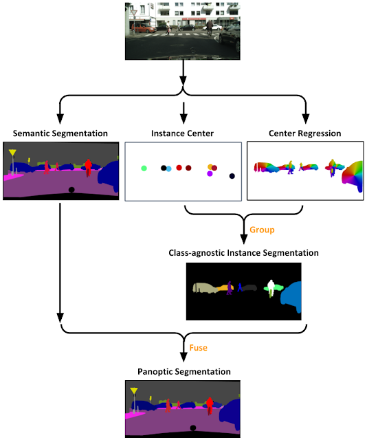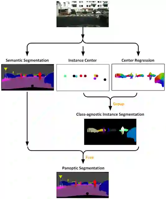Panoptic-DeepLab 概览:语义分割将图像中的像素与一般类相关联,而类无关实例分割步骤则识别与单个对象相关联的像素,不受类的影响。经过综合,即得最终全景分割图像