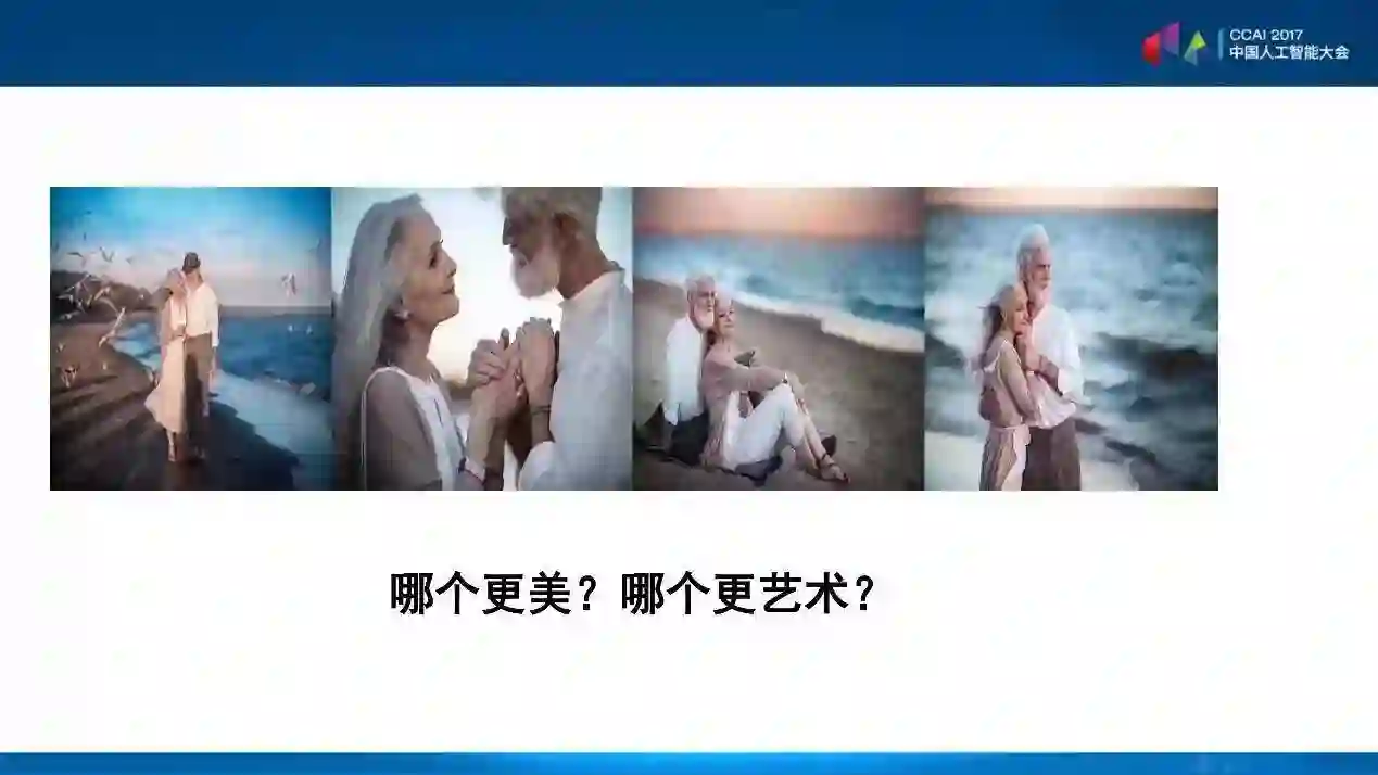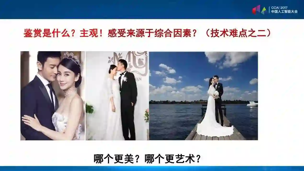 技术难点之二:感受来源于综合因素。我举了两组婚纱照的照片,哪个照片更艺术呢?我们从美的角度来看,显然黄晓明更美一些,但是每个人的感受不一样,这对老夫妻更艺术一点,可能反映我们内心的映射包括希望等等。