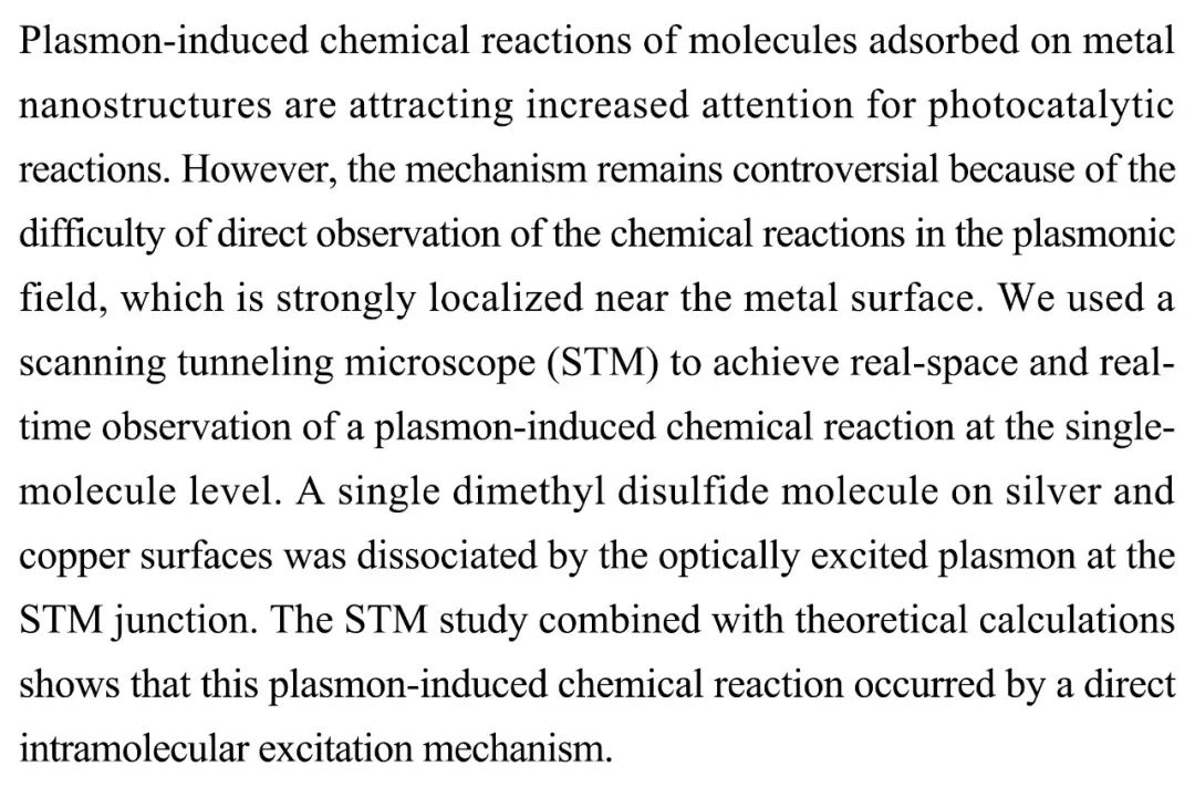 (导读 卓思琪)等离子诱导下发生的吸附于金属纳米结构表面的化学反应在光催化领域大有前景,但对等离子环境下化学反应的直接观测存在困难。本研究利用扫描隧道显微镜(STM)实现了等离子诱导化学反应在单分子水平上的实时、实空间观测。结合 STM 研究和理论计算,表明该等离子诱导化学反应是直接通过分子内激发机制发生的。